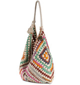 Design & Stil: Diese gehäkelte Hobo-Tasche im farbenfrohen Ethno-Look vereint Lässigkeit und Handwerkskunst.